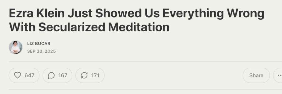 Bucar builds her case on an Ezra Klein–Ta-Nehisi Coates conversation, claiming Klein’s “timid” politics are “directly connected” to "meditation divorced from ethical framework." She then asserts that “historically, Buddhism wasn’t divorced from political action,” pointing to modern episodes like self-immolations in the Vietnam War or Tibetan resistance. But Buddhism has equally been used to institutionalize patriarchy, and most notoriously by Japanese Zen Buddhists supporting fascist atrocities during World War II. Communities deploy the tradition toward their own ends.