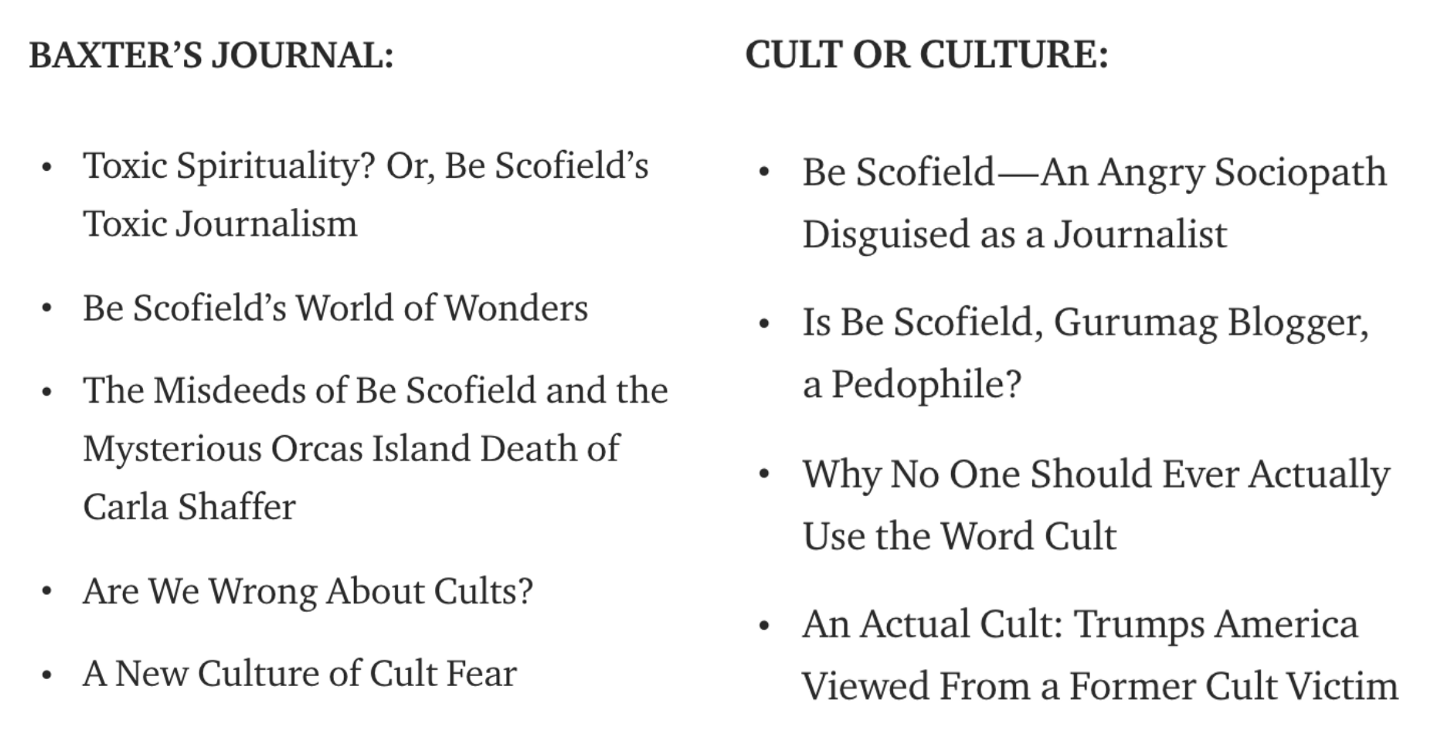 Alexander Fred used several aliases in his articles on the two sites to try to portray me, Be Scofield, as a pedophile, sociopath, druggie, and abuser. These include characters of a psychologist, a fraud investigator, a "group" of colleagues, a married man and a freelance writer for Disney. Each site even contained articles with nearly identical section headlines. From Baxter’s Journal: “How Be Scofield Creates Unethical Journalism.” From Culture or Cult: “How Be Scofield Creates Fake Stories.”